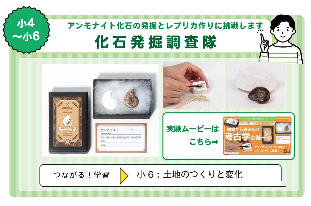 アンモナイト化石の発掘と、レプリカ作りに挑戦!考古学の第一歩を教室で体験できます。アンモナイト岩石を発掘し、化石の型をとり、石こうで化石レプリカを作ります。